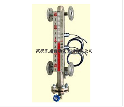 在您选用此产品前我们先将磁性翻柱液位计的工作原理作一简单的介绍。它有一容纳浮球的腔体我们称其为主体管或外壳,它通过法兰或其他接口与容器组成一个连通器;这样它腔体内的液面与容器内的液面是相同高度的,所以腔体内的浮球会随着容器内液面的升降而升降;这时候我们并不能看到液位,所以我们在腔体的外面装了一个翻柱显示器,因为我们在制造浮球时在浮球沉入液体与浮出部分的交界处安装了磁钢,它与浮球随液面升降时,它的磁性透过外壳传递给翻柱显示器,推动磁翻柱翻转180°;由于磁翻柱是有红、白两个半圆柱合成的圆柱体,所以翻转180°后朝向翻柱显示器外的会改变颜色(液面以下红色、以上白色),两色交界处即是液面的高度。